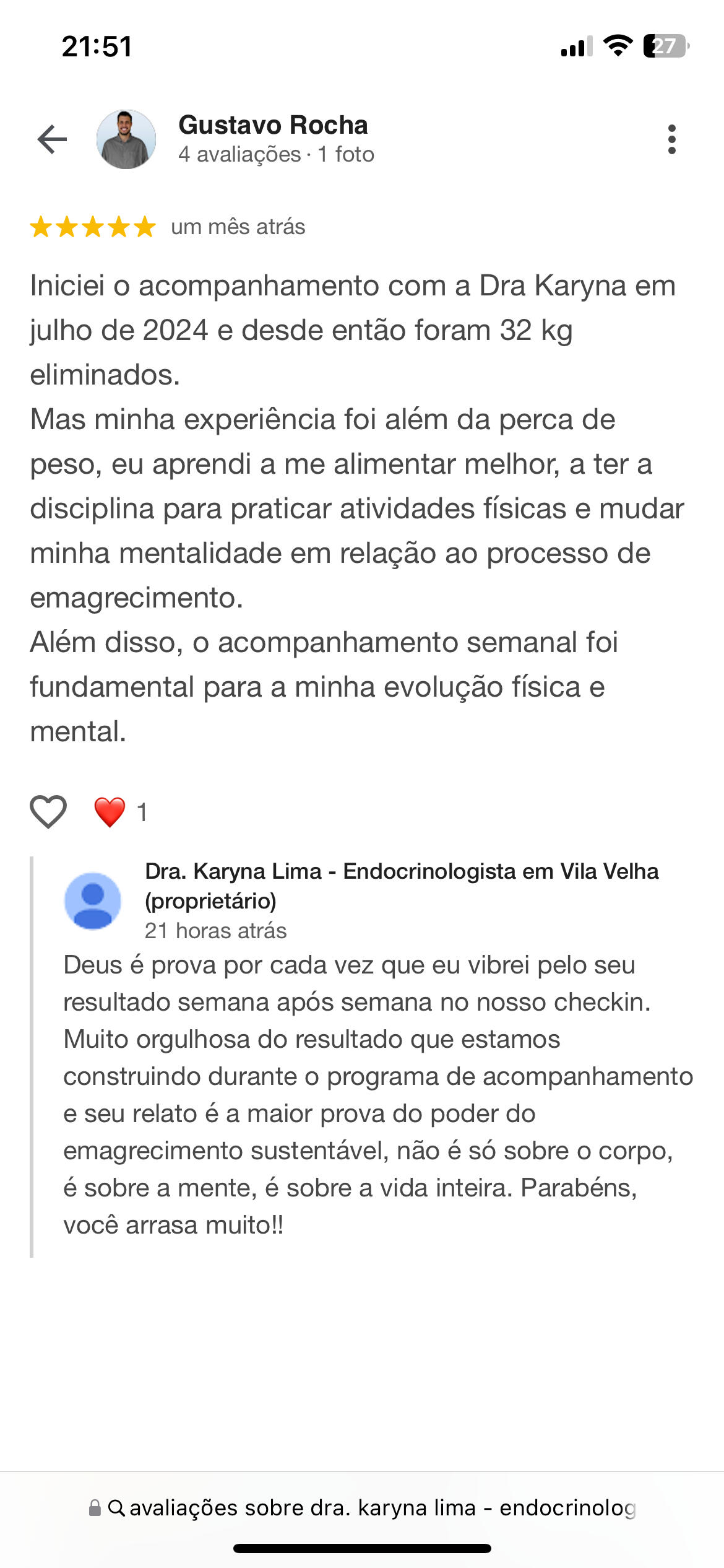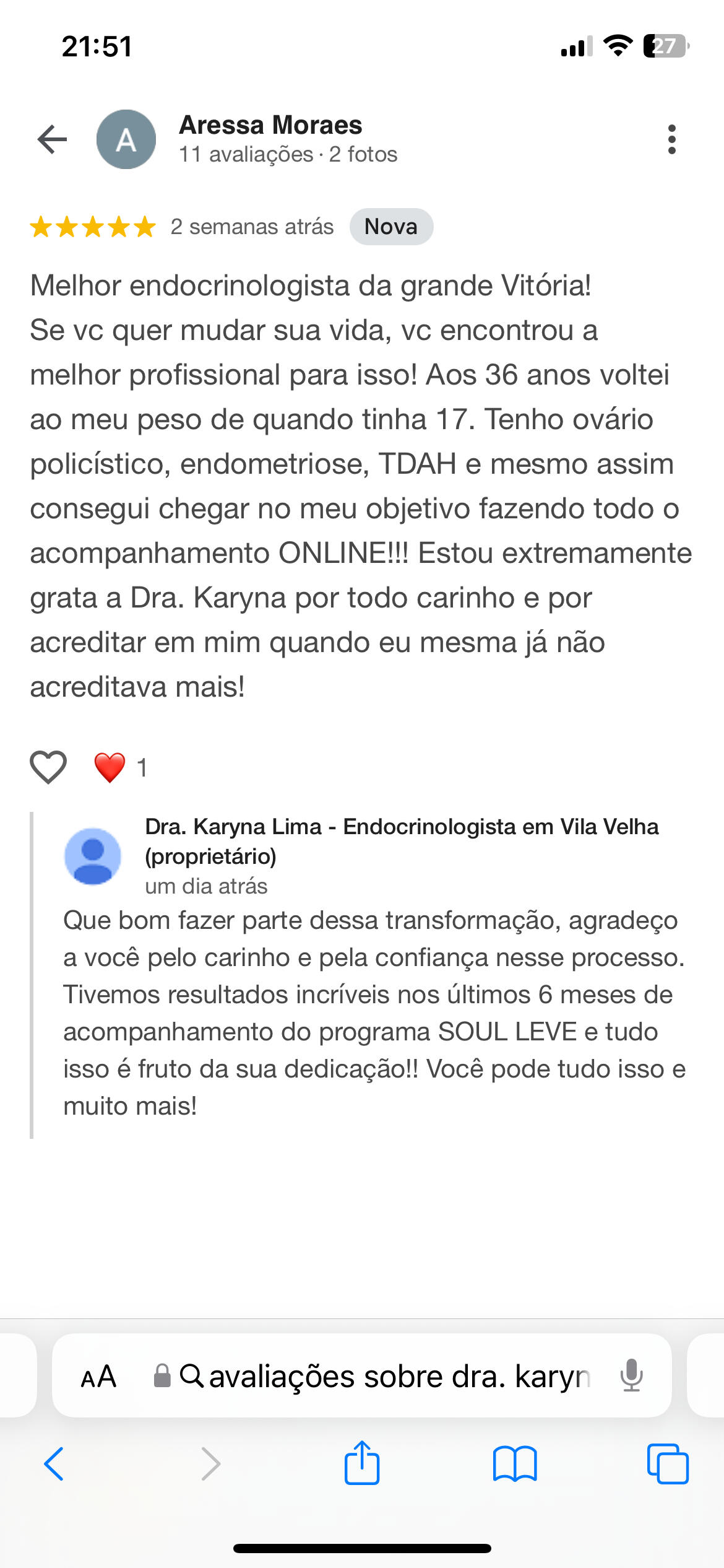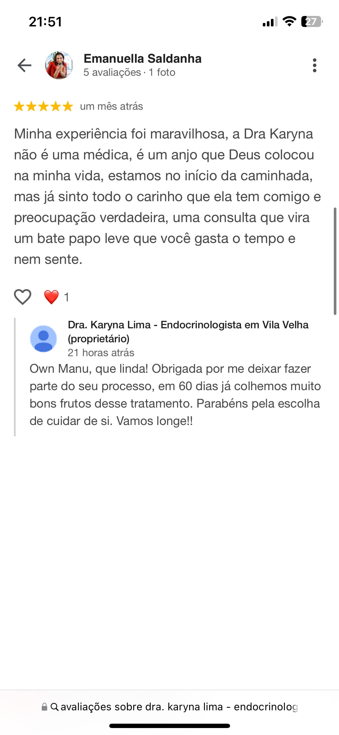 Não espere para cuidar do que mais importa. Agende sua consulta com a Dra. Karyna Lima, seja presencialmente ou online, e comece agora a jornada rumo a uma vida mais saudável. Cada atendimento é personalizado para você, com todo o cuidado e dedicação que sua saúde merece.