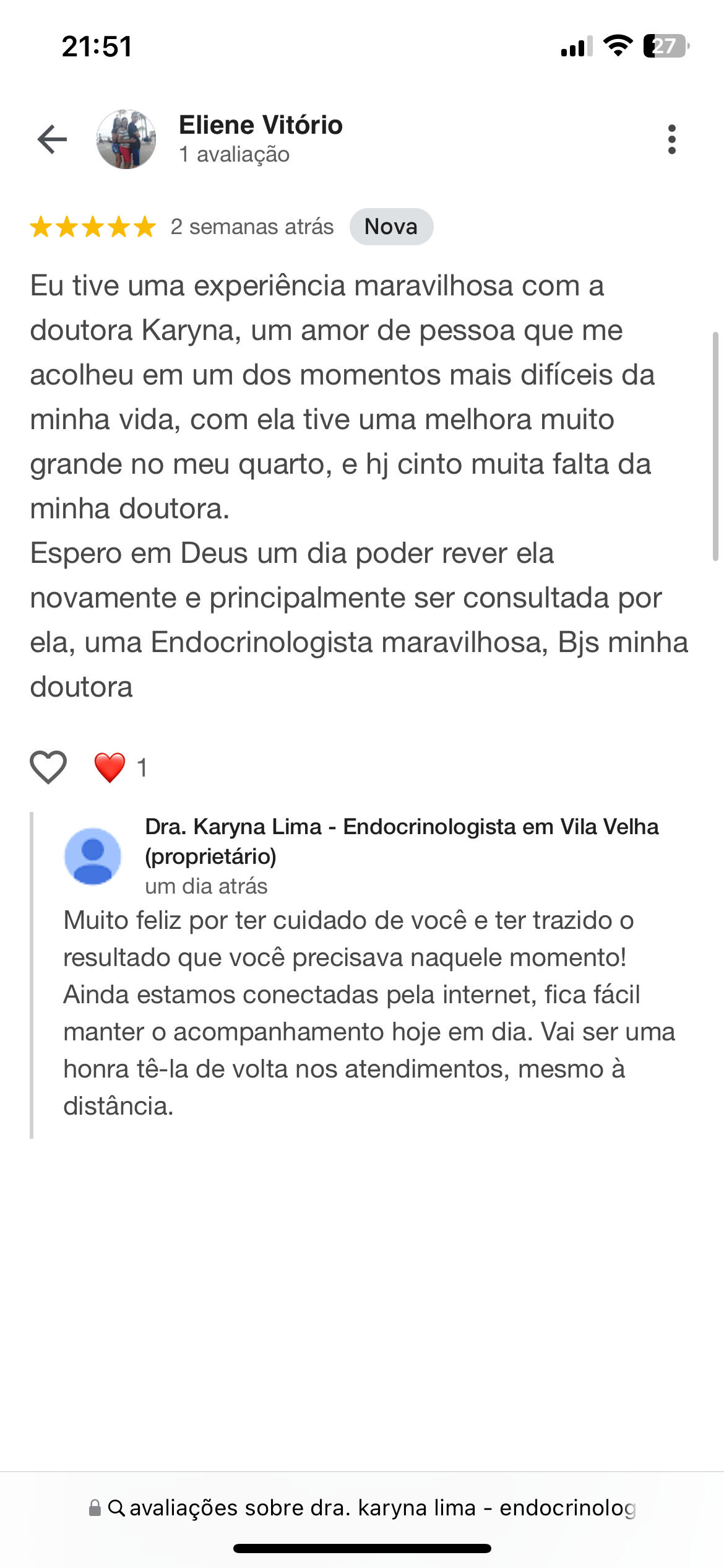 Telemedicina: Consultas Online com a Mesma Qualidade. Se você precisa de flexibilidade ou está distante, a Dra. Karyna também oferece consultas online por telemedicina. Com a mesma dedicação e atenção dos atendimentos presenciais, você pode cuidar da sua saúde sem sair de casa, recebendo orientações e acompanhamento de qualidade, onde quer que esteja. Tudo isso de forma simples, prática e segura.
